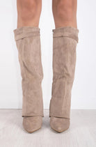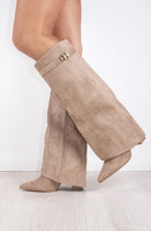 High-heeled boot featuring a beautiful buckle detail and a zipper on the inside.